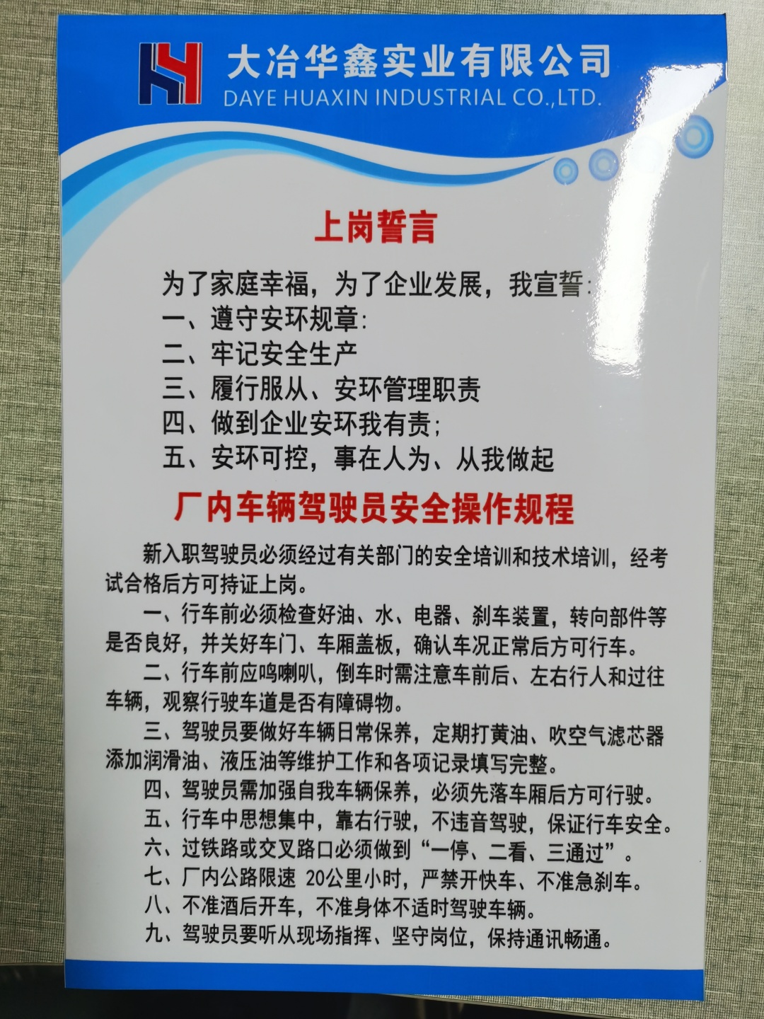车队此次改造不仅只在环境美化下足了功夫。安全方面更细节到每辆车上都张贴着《上岗誓言》、《厂内车辆驾驶员安全操作规范》,一进车队更是抬头随处可见安全宣传栏、墙面上的安全知识海报。在改造过程中车队还对现场环境进行了安全隐患整改,进一步把安全工作做到位。